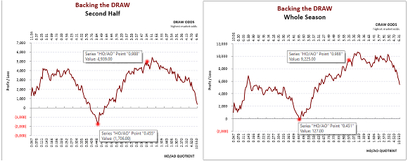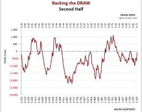 But, as you can see from the odds label at the top of these graphs, a system in this zone would involve backing draws at considerably longer odds (i.e. a far higher risk system), and with only 2,000 units profit made in the previous five seasons.