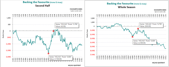 The 1st half-season picture contains a similar shallow rise towards the right-hand side of the profit curve but, like the other two graphs, this is in a zone where odds-on favourites are winning very small increments to the bottom line (amounts which are barely worth the work involved).
