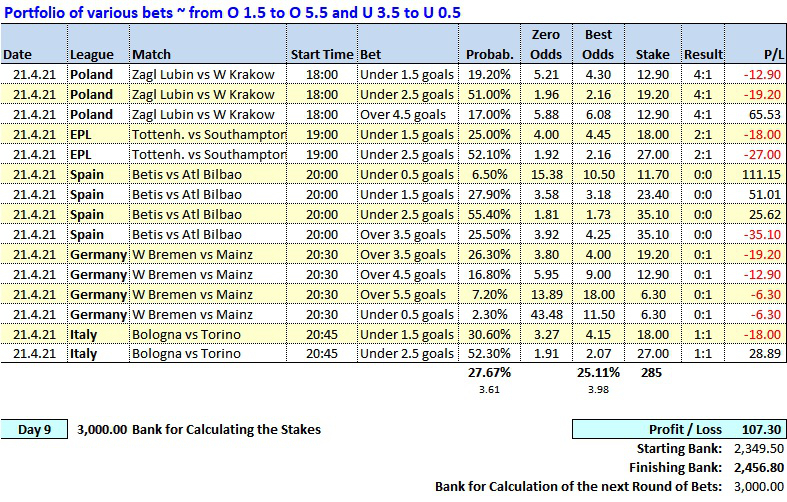 Rather than waiting for the stop loss margin (60% of the bank) to check the stake amounts and prevent total loss of the bank, we reappraised the portfolio and changed the selection rules with effect from 16th April 2021 (betting day 5).